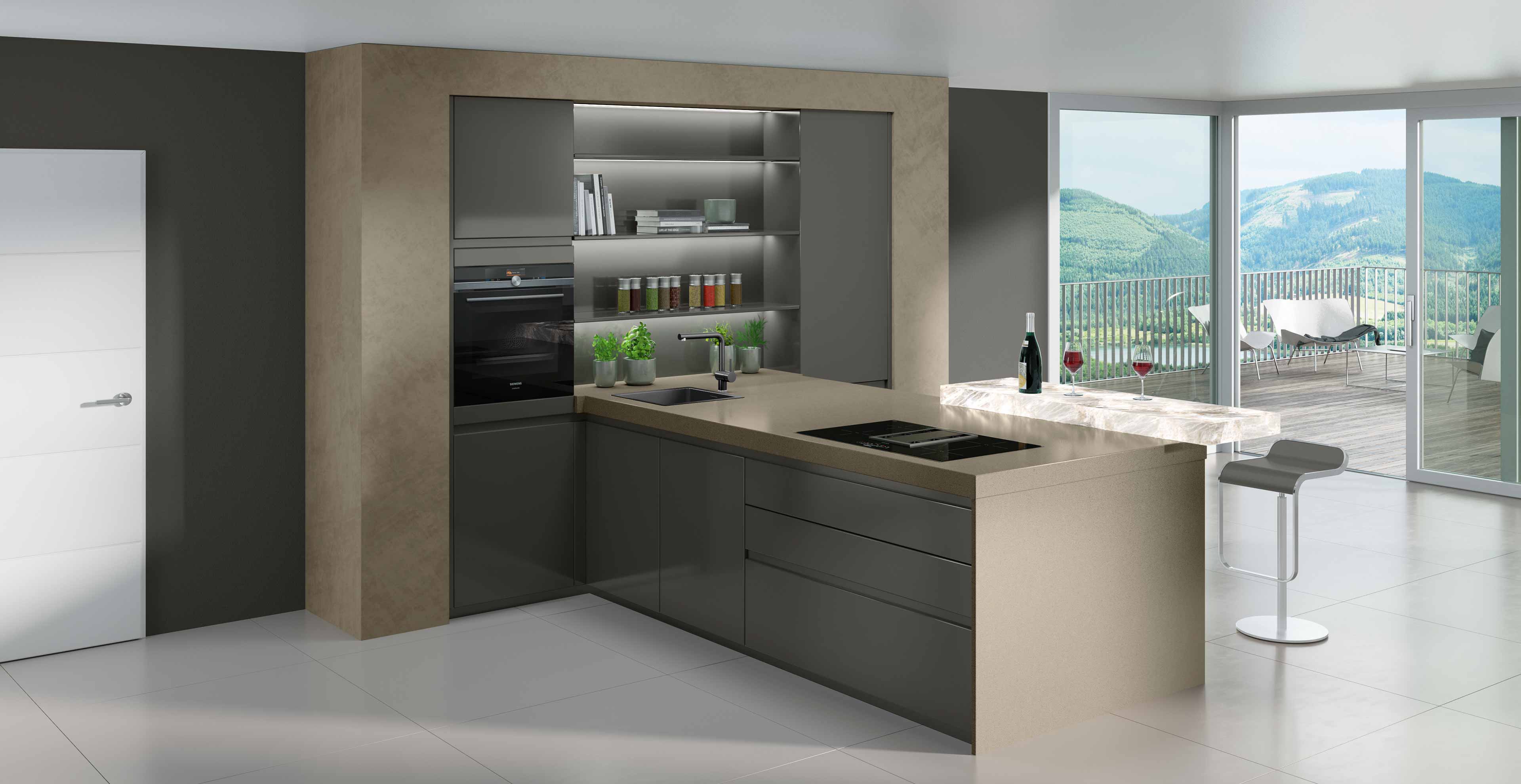 Ein Thekenbereich im Anschluss an die Kochinsel sorgt für eine wohnliche Atmosphäre.