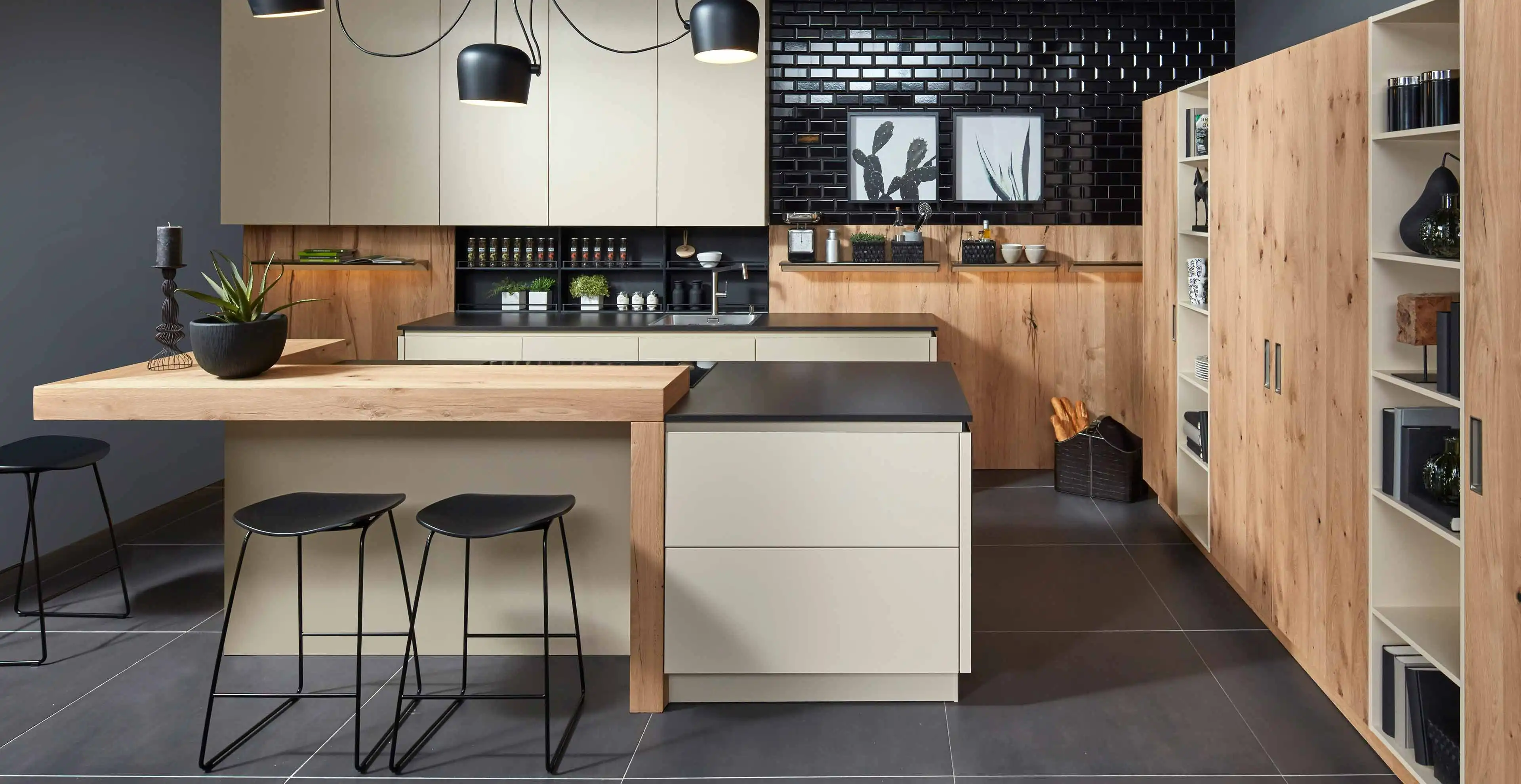 Das passende Sideboard ist die ideale Ergänzung zur Kochinsel und der integrierten Theke. Es bietet Ihnen zusätzlichen Stauraum und unterstreicht das wohnliche Interieur. Offene Regale lockern die Gestaltung dieser Küche auf und bieten Ihnen genügend Platz für Ihre Gewürze, Kochbücher oder persönlichen Wohnaccessoires, die in Ihrer Küche untergebracht werden sollen.