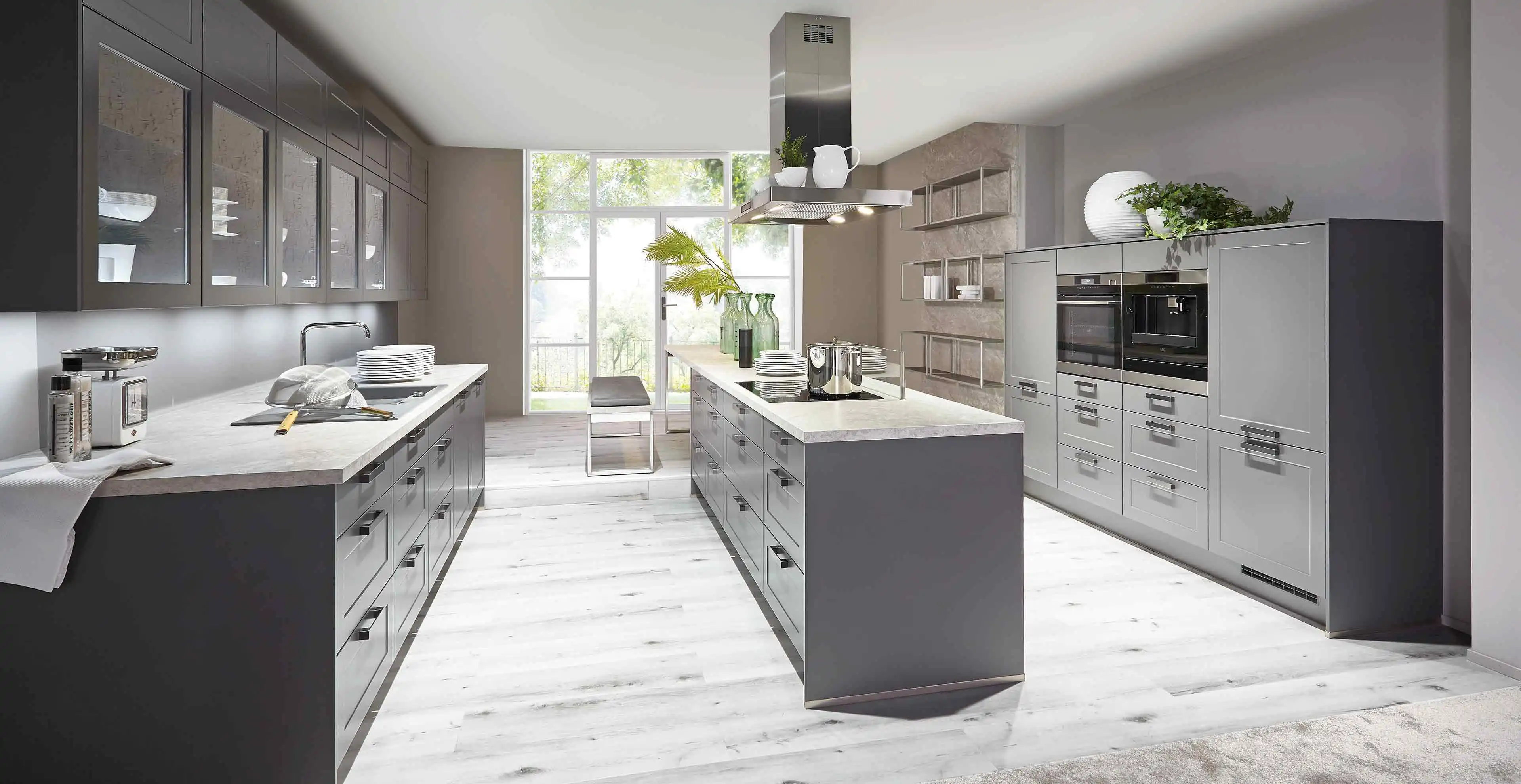 Diese Küche mit Kochinsel ist geprägt von einer klaren und schlichten Farbauffassung, anders als übliche Landhausküchen. Das moderne und zeitlose schiefergrau lebt durch den typischen Landhausstil der Fronten auf. Als Highlight gelten die verglasten Fronten mit den charakteristischen Kranzleisten.