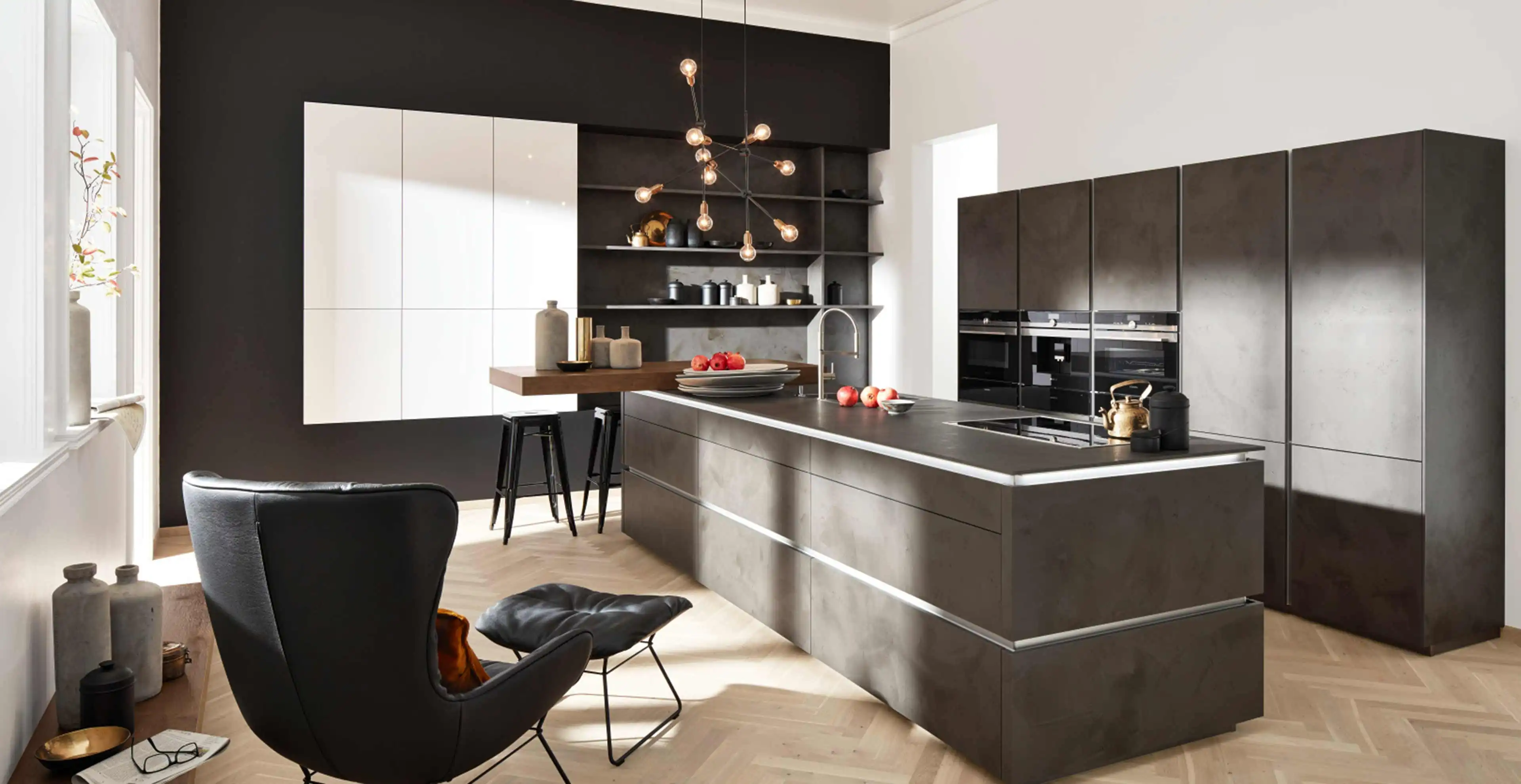 Diese Küche steht für ihre dunkle und matte Front, welche optisch ein echter Hingucker ist. Die grifflose Front, mit der dunklen Granit-Arbeitsplatte Black Jack, wirkt durch ihr einfarbiges Zementmuster zeitlos und harmonisch. Dank dem extrabreiten Auszugssystem wird genügend Stauraum für ihre Küchenutensilien geschaffen. Das Regalelement für die Wand schafft zusätzlich Platz.