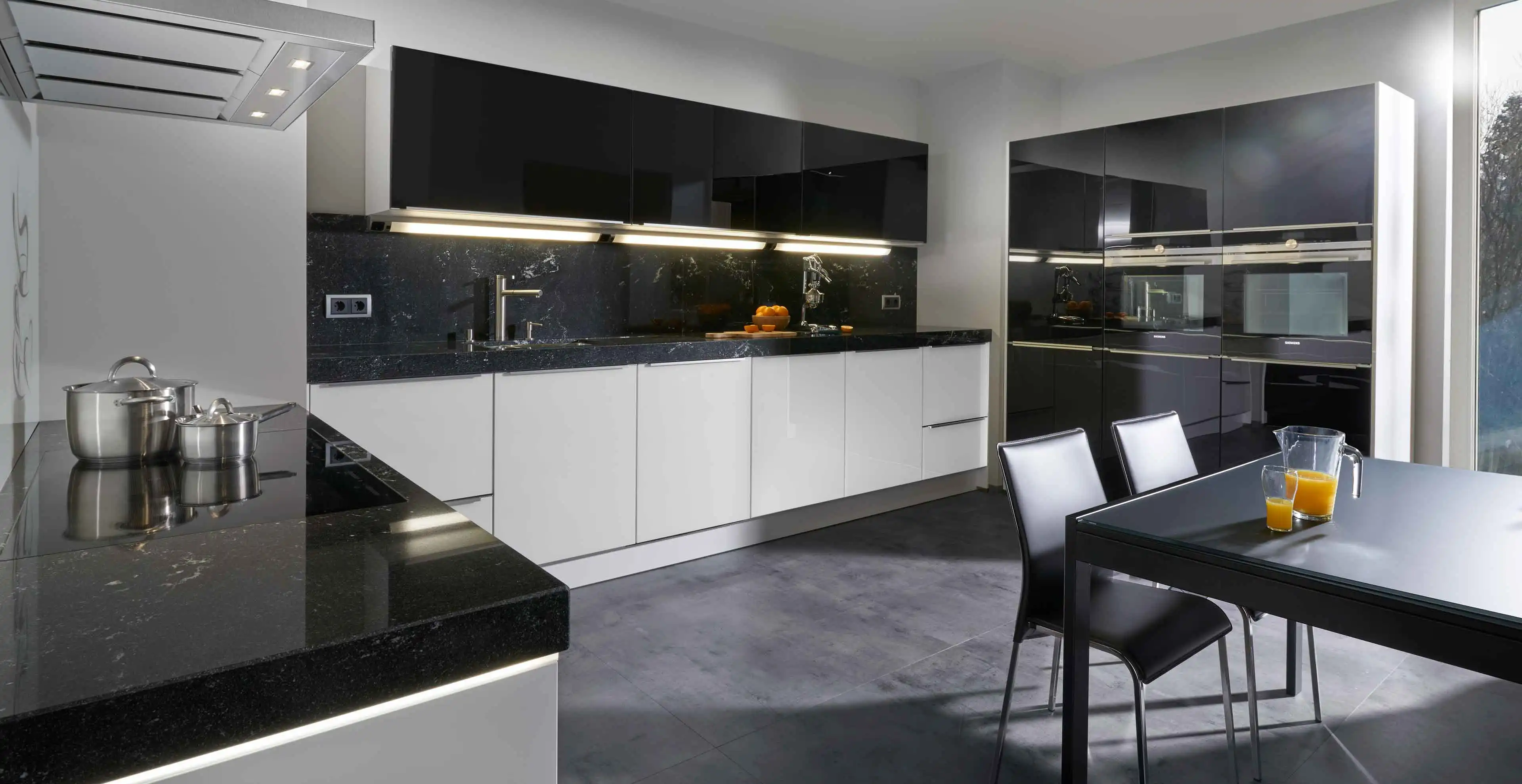 In dieser U-Küche wurde für die Arbeitsnische mit den integrierten Steckdosen, ebenso wie für die Küchenarbeitsplatte, eine schwarze Granitverkleidung gewählt. Das sorgt für einen spannenden Kontrast zu den darunter anschließenden weiß-glänzenden Schränken und belässt die Küche in der modernen Schwarz-Weiß-Farbgebung. Das Kochfeld wurde flächenbündig eingelassen und die Spüle untergebaut. Die klaren Formen machen die Küche modern und erleichtern das Reinigen.